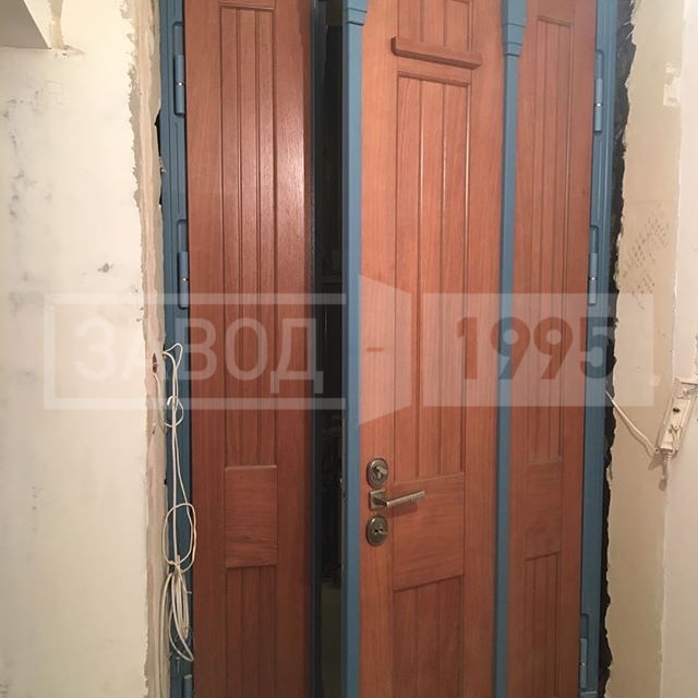 Новые парадные двери полностью имитируют фрезерованный рисунок оригинала, выдержаны в том же цвете. Наружная сторона также выполнена под дерево, фрезеровка оригинала выдержана в точности.